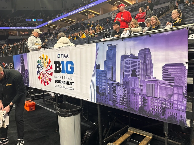 Championship Banner Hung Behind The Iowa Women’s Basketball Team Bench