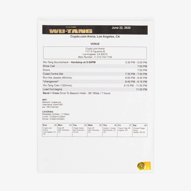 Ghostface Killah's Green Room Wu-Tang Clan Final Chamber Concert Day Sheet (Los Angeles - June 22nd, 2025)